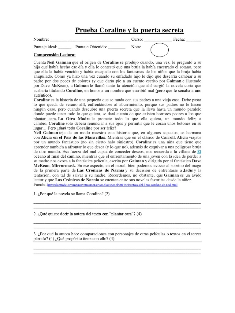 Basta con cruzar el umbral de la puerta y recorrer un lúgubre pasillo para entrar en otra versión de su vida. El piano me toca a mí. Prueba coraline y la puerta secreta.docx. Cuenta neil gaiman que el origen de coraline se produjo cuando, una vez, le pregunt a su hija qu haba hecho ese da y ella le. Ver más ideas sobre coraline, coralain, puertas secretas.
